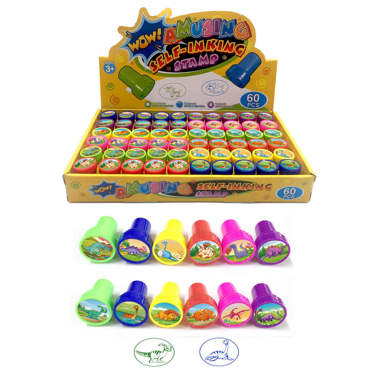 Zestaw dekoracyjnych stempli BeiQi Toys Stamp zawiera 60 samotuszujących stempli ze zmywalnym tuszem. Dostępny w 12 różnych wzorach z dinozaurami, pozwala na personalizację różnych powierzchni. Ma on na celu stymulację zdolności manualnych i kreatywności. Stemple wykonane są z PP, EVA, papieru i tuszu, co zapewnia ich trwałość i łatwość użycia.
