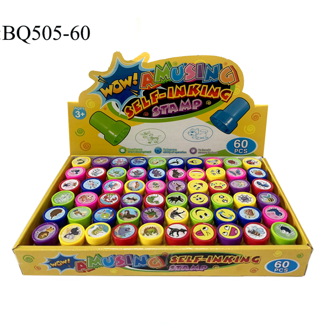 The decorative Stamp set of BeiQi Toys Stamp includes 60 self-inking stamps with washable ink. It comes in 12 different Smile face patterns, allowing you to customize various surfaces. It aims to stimulate manual skills and creativity. These stamps are made of PP,EVA, paper and ink, which ensures their durability and ease of use.